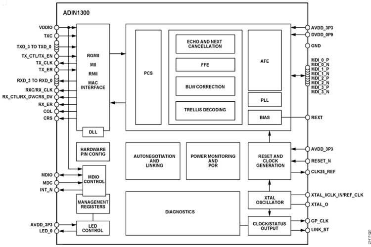 ADIN1300BCPZ在千兆速度下支持150米电缆,在100 Mbps或10 Mbps速率下工作时支持180米电缆.