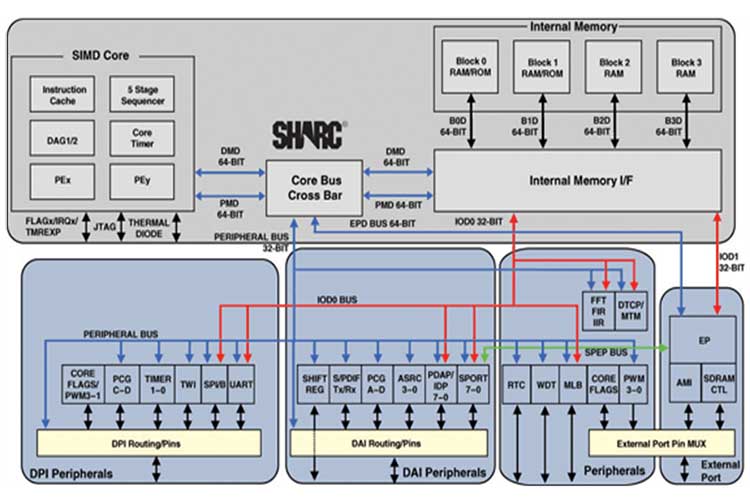 第四代SHARC处理器还集成了专用外设,以简化硬件设计\减少设计风险,并最终缩短上市时间.组合在一起的功能模块称为数字应用接口(DAI),这些功能模块可以互相连接,或通过可以由软件编程的信号路由单元(SRU)连接到外部引脚.SRU是创新的架构特性,能够在DAI模块之间实现完整且灵活的路由.通过SRU连接的外设包括但不限于串行端口\SPI端口\S/PDIF Tx/Rx,以及八通道异步采样速率转换器模块.第四代SHARC允许通过DMA控制器将数据直接从串行端口传输至外部存储器.而UART与双线式接口等其它外设则通过数字外设接口(DPI)进行中继.