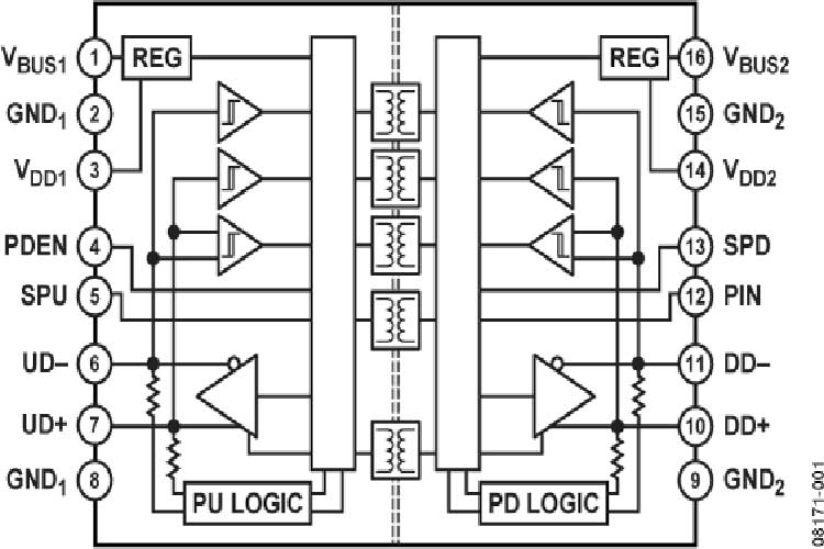 许多微控制器实施的USB只向外部引脚提供D+和D−线路.这在许多情况下都符合需求,因为它仅需极少的外部器件,并简化了设计;不过,当需要隔离时,这会带来难题.USB线路必须自动在主动驱动D+/D−\接收数据与允许外部电阻设置总线空闲状态之间切换.ADuM4160结构既可以检测数据流向,同时能够控制输出缓冲的状态.数据流向根据一个个分组确定.