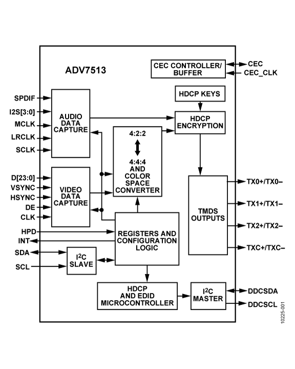 ADV7513支持S/PDIF和8通道I2S两种音频格式.高保真8通道I2S接口可以传输高达768 kHz的立体声或7.1声道环绕声音频.S/PDIF接口可以传送包括Dolby® Digital\DTS®和THX®在内的压缩音频.ADV7513采用先进的CMOS工艺制造,提供64引脚表贴塑封LQFP封装(带裸露焊盘),额定温度范围为-25℃至+85℃.