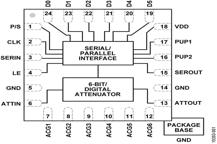 HMC624ALP4E集成两个裸片:CMOS驱动器和砷化镓(GaAs) RF衰减器.CMOS驱动器支持对RF衰减器进行串行和并行控制.该器件还提供用户可选上电状态和串行输出端口,可级联其他串行控制元件.