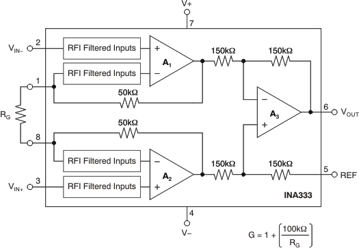 可通过单个外部电阻在 1 到 1000 范围内设置增益.INA333 设计为采用符合行业标准的增益公式:G = 1 + (100kΩ/RG).