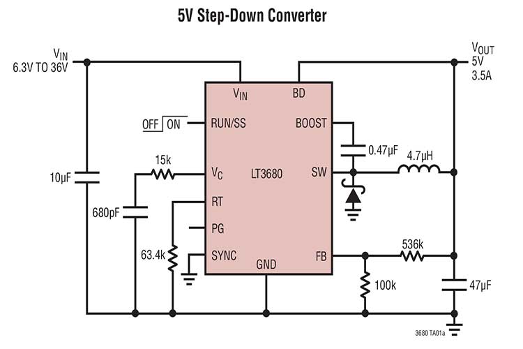 LT3680IDD#TRPBF是一款可调频率 (200kHz 至 2.4MHz) 单片式降压型开关稳压器,可接受高达 36V 的输入电压.芯片上内置了一个高效率 95mΩ 开关\一个升压肖特基二极管以及必需的振荡器\控制器和逻辑电路.电流模式拓扑结构用于实现快速瞬态响应和上佳的环路稳定性.低纹波突发模式操作可在低输出电流条件下保持高效率,并能够在典型应用中将输出纹波抑制在 15mV 以下.此外,LT3680 还能通过在VOUT 高于 3V 时从输出吸收偏置电流,以进一步提升低输出电流效率.停机模式把输入电源电流减小至 1μA 以下,而 RUN/SS 引脚上的一个电阻器和电容器则提供了一个受控的输出电压斜坡 (软起动功能).当 VOUT 达到编程输出电压的 91% 时,一个电源良好标记将发出指示信号.LT3680 采用 10 引脚 MSOP 和 3mm x 3mm DFN 封装,该封装具有裸露衬垫,旨在实现低热阻.