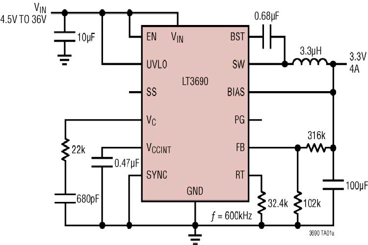 LT3690EUFE#TRPBF的特性是运行可靠且易于配置.在UVLO引脚上使用电阻分压器可实现可编程的欠压锁定.当VOUT达到已编程输出电压的90% 时,将会指示电源正常标记.保护电路将会检测电源开关中的电流以防止LT3690发生短路情况.频率折返和热关断提供额外保护.LT3690采用4 mm × 6 mm QFN封装,具有裸露焊盘以实现低热阻.