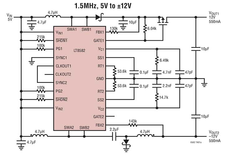 LT8582IDKD#TRPBF是众多局部电源设计的理想选择.每个通道可以容易地通过配置而成为升压\SEPIC\负输出或反激式结构.两个通道总共能够从一个 5V 输入产生一个 12V 和一个 -12V 输出以及 14.4W 的组合输出功率.此外,LT8582 的从开关还允许将该器件配置成高电压\高功率充电泵拓扑结构,相比于传统型电路,这种拓扑结构的效率更高\所需的组件更少.