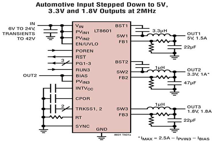 高电压通道是同步降压型稳压器,其依靠一个 3.0V 至 42V 输入供电运作.输出电流高达 1.5A (OUT1) 和 2.5A (OUT2).低电压通道采用一个 2.6V 至 5.5V 输入供电运作.内部同步电源开关可提供高效率和高达 1.8A 的输出电流.LT8601 采用了一个两相时钟,通道 1 的运作与通道 2 和 3 的运作异相 180°,从而减小了高电压 (HV) 和低电压 (LV) 输入端上的输入纹波电流.所有的通道均具有逐周期电流限制,因而可提供针对短路输出的保护作用.热停机提供了额外的保护功能.