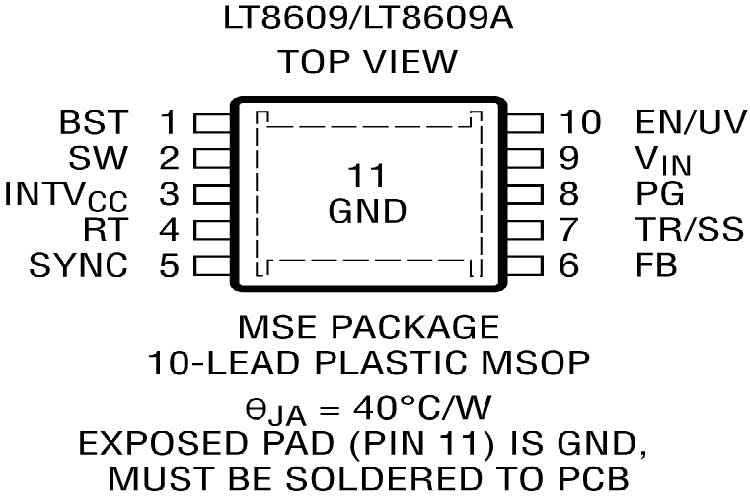 LT8609AIMSE#TRPBF 是一款紧凑\高效且高速的同步单片降压型开关稳压器,当输出稳定在 5V 时,仅消耗 1.7µV 的非开关静态电流.LT8609/LT8609A/LT8609B 可以提供 3A 连续电流.突发模式操作可实现高效率\非常低的输出电流,同时保持输出纹波低于10mVP-P.SYNC 引脚允许与外部时钟同步,或在降低 EMI 操作中使用展频调制.具有峰值电流模式拓扑的内部补偿允许使用较小的电感器,从而实现快速瞬态响应和良好的环路稳定性.EN/UV 引脚具有准确的 1V 阈值,可用于编程 VIN UVLO 或关闭该部件.TR/SS 引脚上的电容器可在启动期间设置输出电压的斜率,而当可调 输出部件上的 VOUT 在 ±8.5% 之内,或可编程输出电压的 固定输出部件和故障情况 ±在7.5% 之内时,PG 会发出信号. LT8609A 具有较慢的交换芯片终端,以降低 EMI 辐射.LT8609B 仅在脉冲跳跃模式下工作.