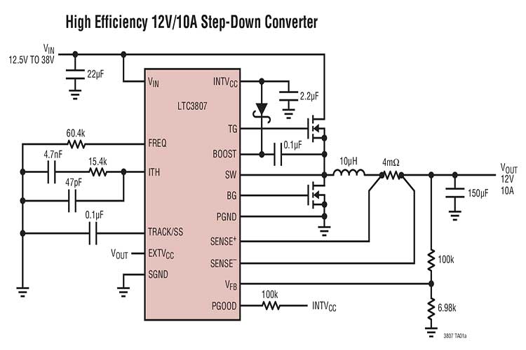 50μA 的无负载静态电流延长了电池供电型系统中的操作运行时间.OPTI-LOOP® 的运用使得能够在一个很宽的输出电容和 ESR 数值范围内优化瞬态响应.LTC3807 具有一个精准的 0.8V 基准和一个电源良好输出指示器.4V 至 38V 的宽输入电源范围囊括了众多的中间总线电压和电池化学组成. LTC3807 的输出电压可设置在 0.8V 至 24V 之间.