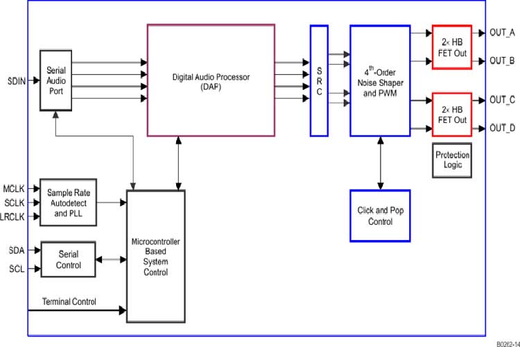 TAS5731MPHPR只能作为从属器件,从外部源接收所有时钟. 根据输入采样率的不同,TAS5731 运行时带有 384kHz 开关速率至 352KHz 开关速率间的的脉宽宽度调制 (PWM) 载波. 与四阶噪声整形器结合的过采样可提供一个白噪音基准以及从 20Hz 至 20kHz 的出色动态范围.