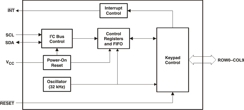 按键控制器可对输入进行消抖以及保持用于存储按键按压和释放事件的 10 字节 FIFO.该 FIFO 借助溢出绕回功能可存储多达 10 个按键事件.中断 (INT) 输出可配置为在发生按键按压和按键释放事件时,或这些事件达到最大速率时报警.