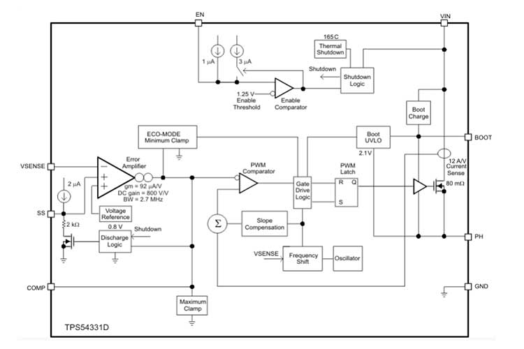 TPS54331DR器件是一款 28V\3A 非同步降压转换器,集成有一个低 R DS(on) 的高侧 MOSFET.为了提高轻负载条件下的效率,将自动激活脉冲跳跃 Eco-mode 特性.此外,1µA 的关断电源电流使得此器件可用于电池供电类应用.具有内部斜坡补偿的电流模式控制简化了外部补偿计算,并在允许使用陶瓷输出电容器的同时减少了元件数量.一个电阻分压器对输入欠压锁定的迟滞进行编程.过压瞬态保护电路可限制启动期间和瞬态条件下的电压过冲.逐周期电流限制方案\频率折返和热关断特性可在过载条件下对器件和负载施加保护.TPS54331 器件可采用 8 引脚 SOIC 封装和 8 引脚 SO PowerPAD 集成电路封装,这些封装经过内部优化可改进热性能.