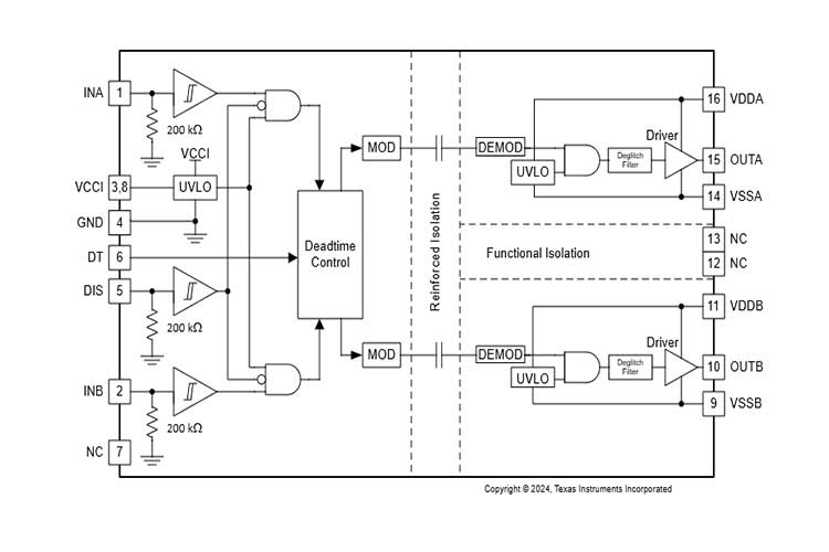 输入侧通过一个 5.7kVRMS 增强型隔离栅与两个输出驱动器相隔离,其共模瞬态抗扰度 (CMTI) 的最小值为 125V/ns.两个二次侧驱动器之间采用内部功能隔离,支持高达 1500VDC 的工作电压.