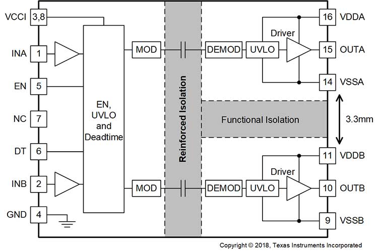 输入侧通过一个 5.7kVRMS 增强型隔离栅与两个输出驱动器相隔离,其共模瞬态抗扰度 (CMTI) 的最小值为 125V/ns.两个次级侧驱动器之间的内部功能隔离支持高达 1850V 的工作电压.